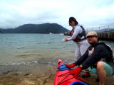 カヤックに乗りこむ時は、膝まで水に浸かります。また、座席に水がかかりますので、必ず、濡れてもよい服装にする必要があります。